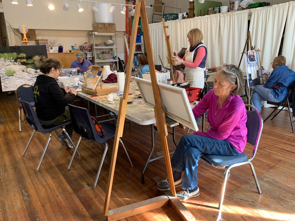 Reasonably priced studio space with a group of congenial painters working with various media. We have a monthly critique by a local artist, visit local shows and have fun painting with a diverse group of artists. Join us, we have fun!